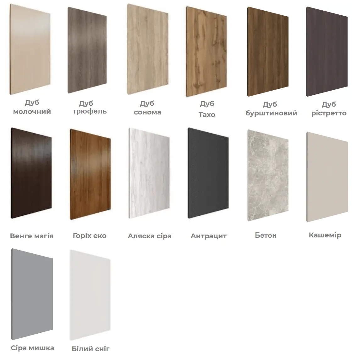 Корпус та фасади представлені у 14 кольорах (ЛДСП).