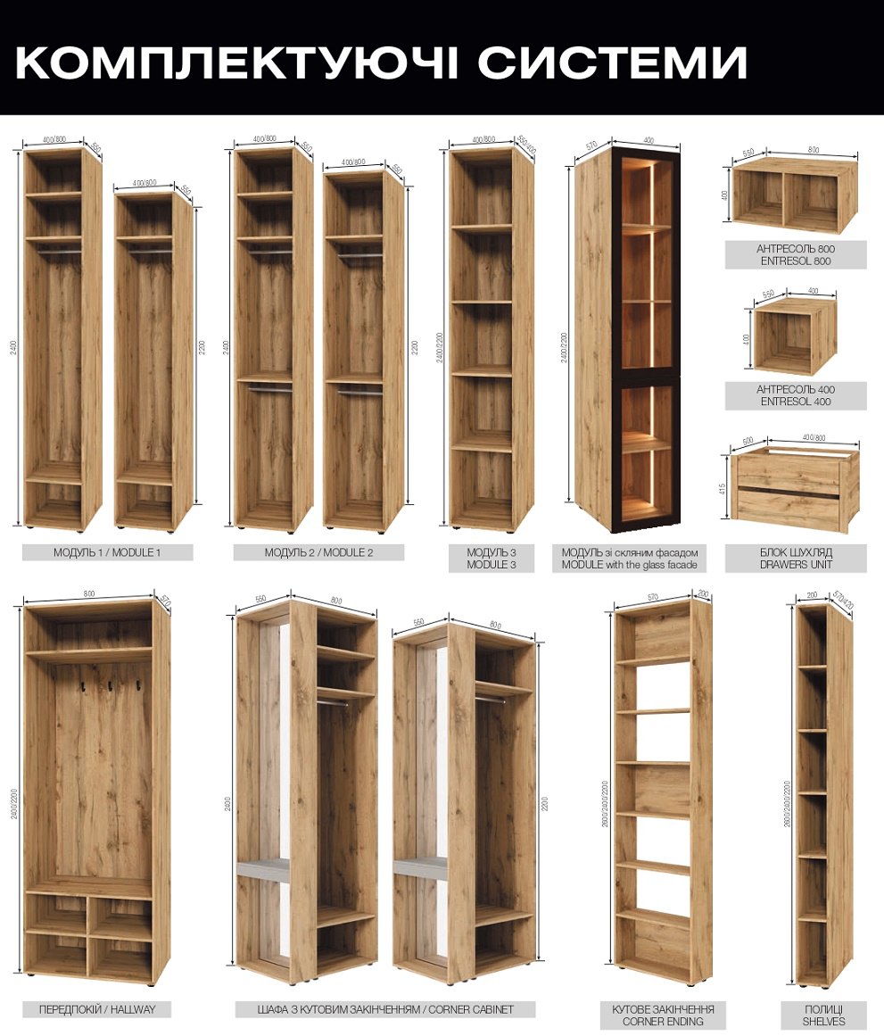 Модульна система Space пропонує широкий спектр модулів з варіаціями по ширині та вімоті, які можуть бути комбіновані залежно від потреб користувача. Це дозволяє створювати унікальні інтер'єри, що відповідають вимогам як стильного оформлення, так і практичності.