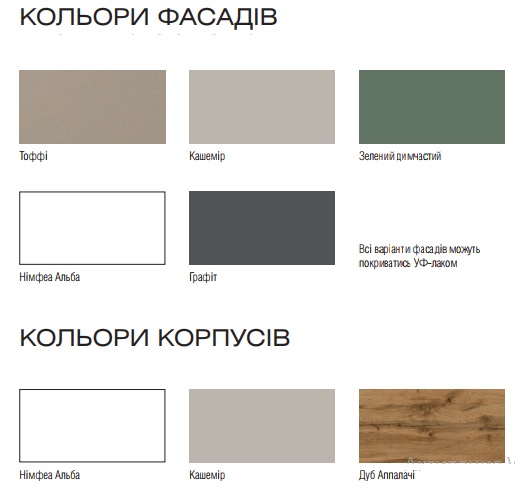 Кольори Фасадів ДСП: Тоффі / Кашемір / Німфея Альба / Графіт/Зелений димчастий.