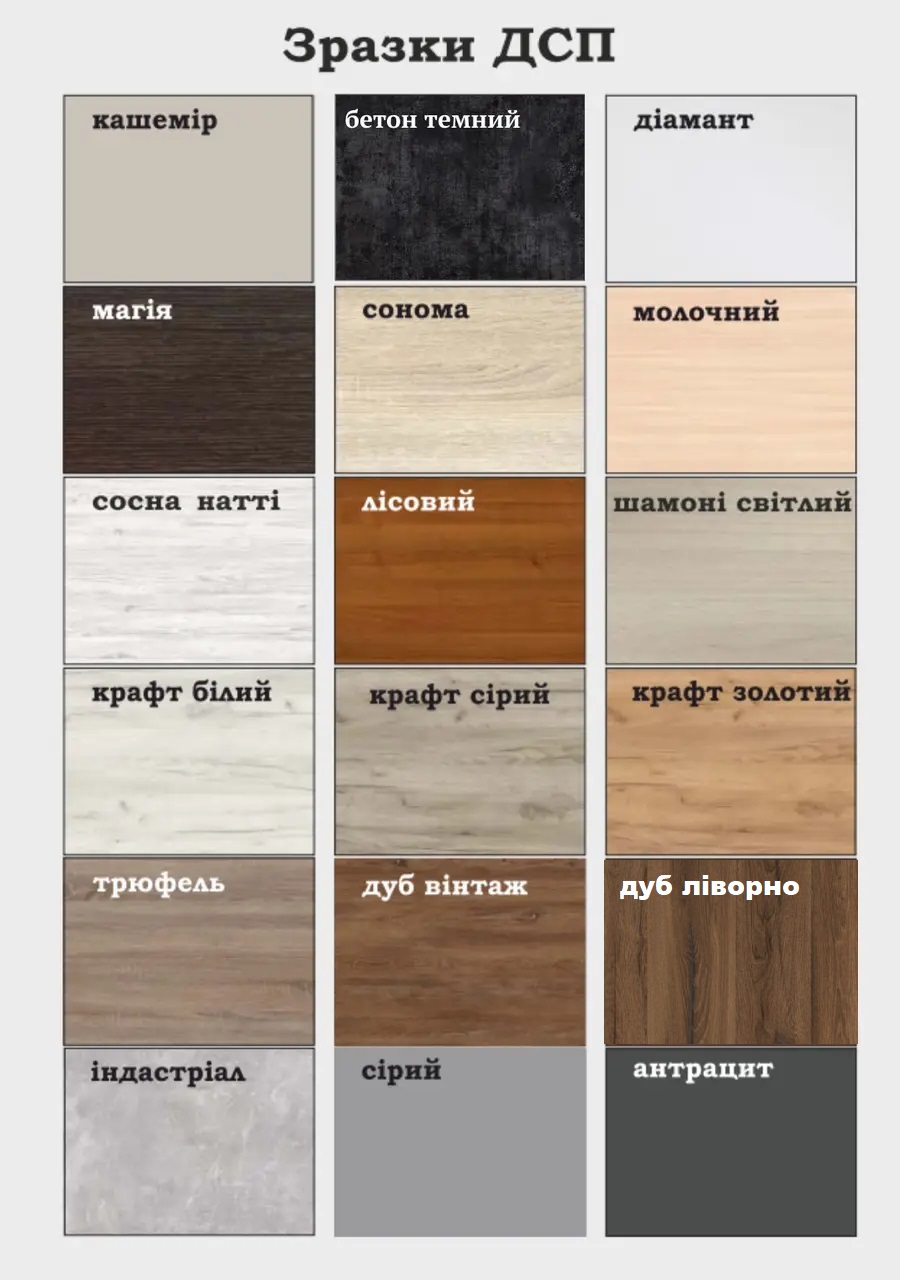 Кромка ПВХ 0,5 мм в основному, деякі деталі можуть бути з кромкою 2 мм (наприклад, у деяких столах).
